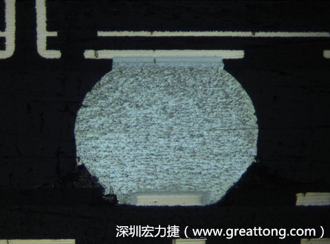 通常拿到一張BGA的切片照片時,第一個要判斷的就是那一邊屬于BGA的封裝面,那一邊又是屬于電路板組裝面。對于這個問題,我的方法是從銅箔的厚度來做判斷,銅箔比較厚的那一面通常是電路板組裝面,因?yàn)锽GA封裝的載板通常都比電子組裝的電路板來得薄,所以會選用比較薄的銅箔厚度。